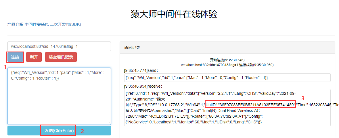 第一步:猿大师中间件安装完毕后,用浏览器打开测在线体验网址(http://test.yuanmaster.com/),点击 连接 连接中间件服务器,显示连接成功后,发送命令: